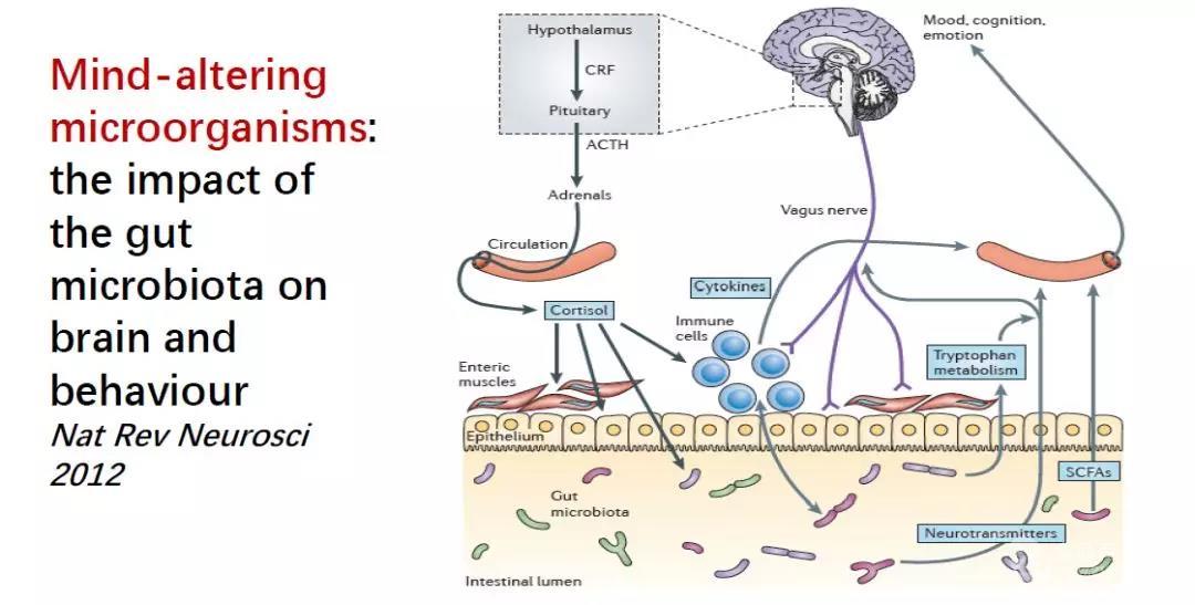 3、 精神益生菌:這一類(lèi)能夠通過(guò)腸-腦軸線(xiàn)影響腦和行為,它們能夠活化腸道神經(jīng)系統(tǒng),活化腸道黏膜系統(tǒng),產(chǎn)生代謝物,影響中樞神經(jīng)。